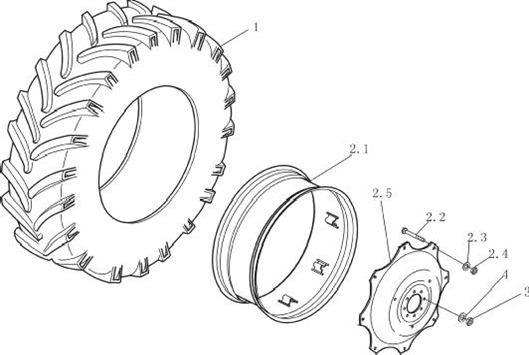 9.5-24 水田前轮总成 9.5-24 前轮总成① 水田前驱动轮轮胎 9.5-24(含内外胎)驱动轮轮胎 9.5-24 (含内外胎) ① 轮辋与辐板合件 (W8-24)
