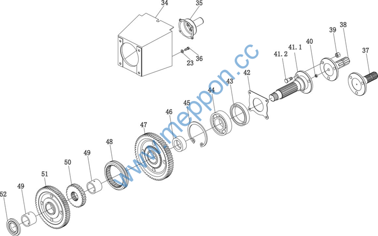 Dowel pin, housing, brake 10×19.5 Shaft, planetary gear Bearing 42607E Planetary gear Retainer ring 80 Spacer Shim, live axle |